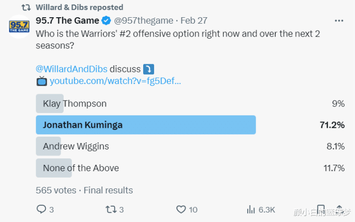 两天之前铁汉媒体95.7The Game就统计谁是铁汉过去第二巨头,库明加有71.2%的投票,如今锋线上的威金斯离队了,库明加的入手权与球权占有率会无间训导,他势必是受益最大者。